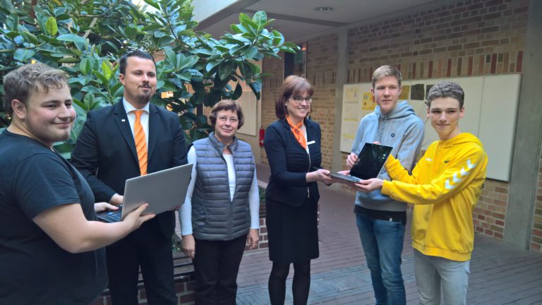 Sparen lohnt sich eben doch – auch in Zeiten von Niedrig- und Negativzins. Das bewies uns am vergangenen Donnerstag Rico Lange von der VR-Bank Elsterland, der Frau Kaufhold und drei Schülervertretern unseres Gymnasiums zwei nagelneue Laptops im Wert von 1098 Euro übergab. Das Geld für die Spende stammt aus den Gewinnen der „Gewinnsparlose“, wie Herr Lange erklärte – eine Aktion, mit der die Volksbank verschiedene Schulen in der Region unterstützt. Natürlich wollten die Vertreter der Bank auch gleich wissen, für was unser Gymnasium die Notebooks verwenden will. „Da gibt es ganz vielfältige Möglichkeiten“, erklärte Frau Kaufhold, „denn die Aufgaben der Schule haben sich in Zeiten der Digitalisierung gewandelt.“ Es gebe neue Herausforderungen, die einerseits durch die Aufgabenformate der neuen Lehrpläne bedingt sind und für deren Umsetzung eigentlich jeder Schüler einen PC bräuchte. Natürlich reichen die fest installierten PC-Räume nicht aus, um alle Schüler mit der neuen Technik vertraut zu machen, die sie später im Beruf beherrschen müssen – bei 625 Schüler sind selbst die vom Land Sachsen-Anhalt geförderten 40 Notebooks eine geringe Zahl. Insofern sind wir am Gymnasium Jessen sehr dankbar für die Spende der Volksbank, durch die wir die Zahl der verfügbaren Laptops etwas erhöhen können. „Wir nutzen die Laptops recht häufig“, fügte Matteo S. hinzu, „gerade erst heute im Fach Englisch – recherchieren, analysieren, zusammenfassen, Präsentationen erarbeiten, das machen wir häufig mit dem Laptop“. „Außerdem“, fügte Ole B., Schülersprecher unseres Gymnasiums noch hinzu, „ist es heutzutage wichtig, dass es die Möglichkeit zur Einübung von Medienkompetenz gebe.“ Dem konnte auch Frau Kaufhold nur zustimmen. Zwar können die meisten Schüler mit dem Smartphone umgehen – für den Unterricht ist das allerdings deswegen kein geeignetes Medium, da die Verfügbarkeit des Internets vom Datenvolumen abhänge, und damit für die Eltern Kosten entstünden, die nicht zu rechtfertigen sind. Und da unser Gymnasium zu den 26 landesweit geförderten Schulen zählt, die über modernstes Glasfaser-Internet verfügen werden, sind die Laptops die beste Möglichkeit, allen Schülern den Zugang zum Internet zu ermöglichen.