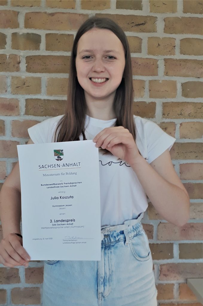 Für Julia Koszuta aus der Klasse 9a hat sich der Aufwand gelohnt! Beim diesjährigen Bundeswettbewerb Fremdsprachen im Fach Latein errang sie einen hervorragenden 3. Platz in der Kategorie „Solo“.