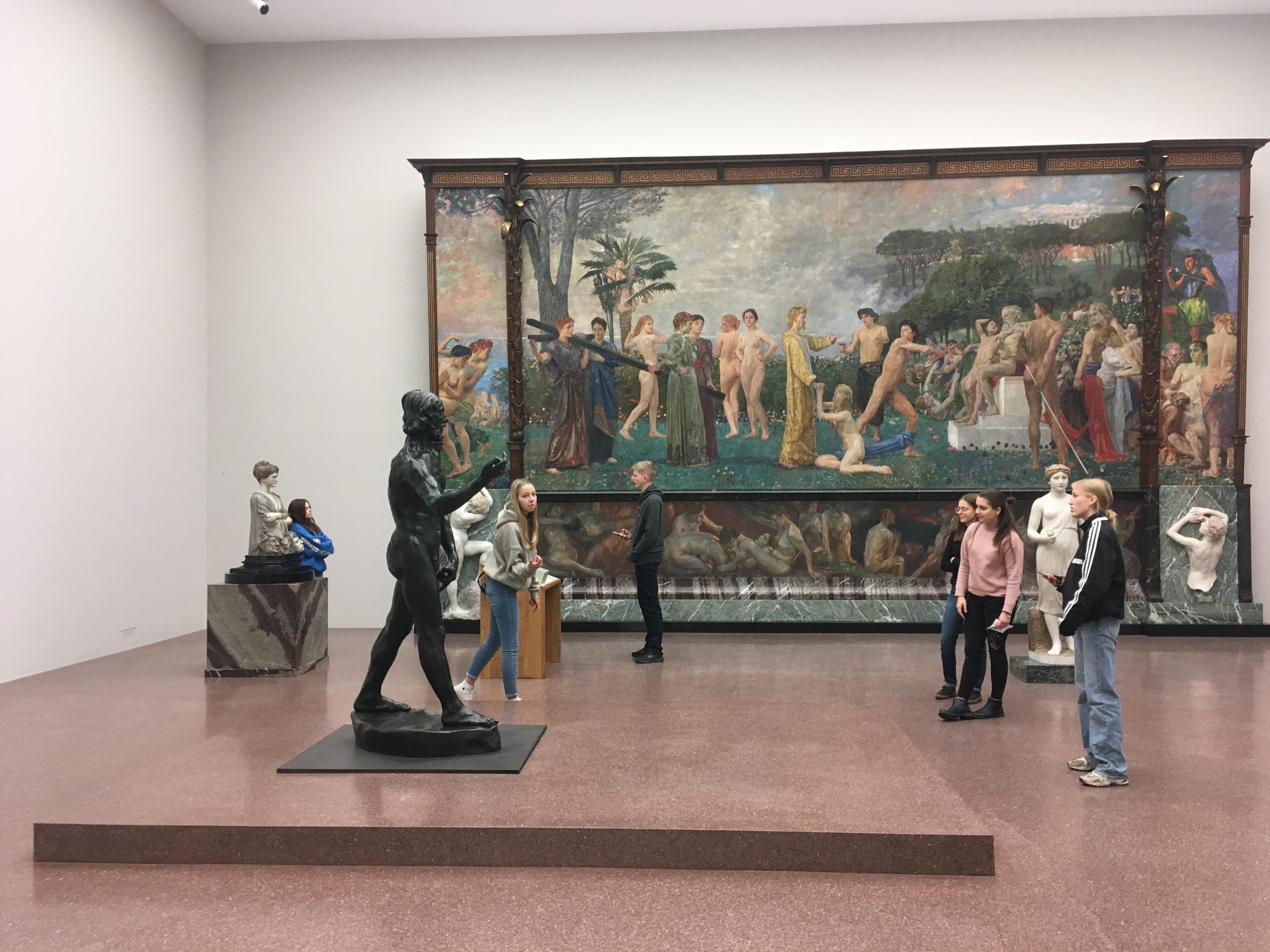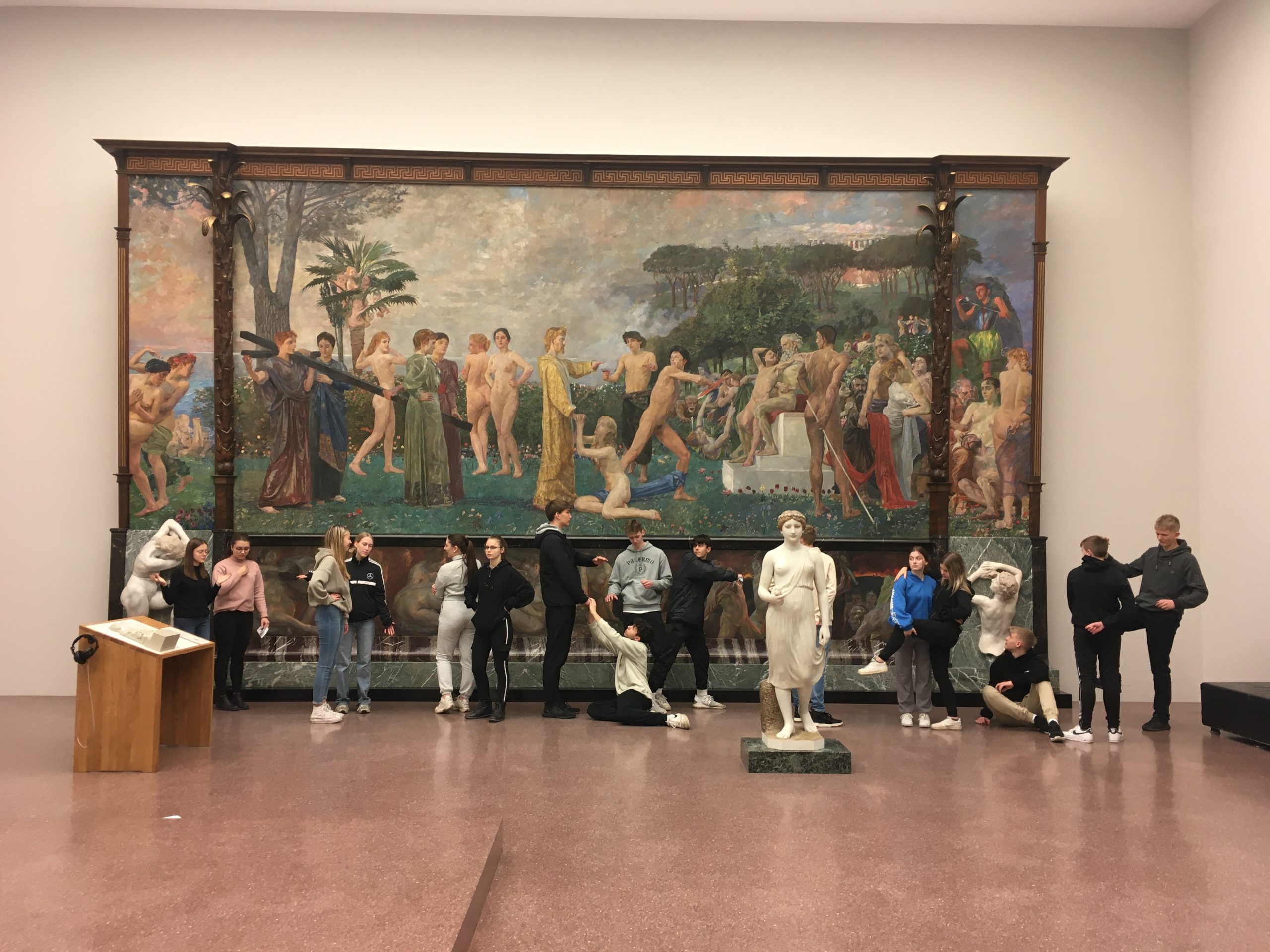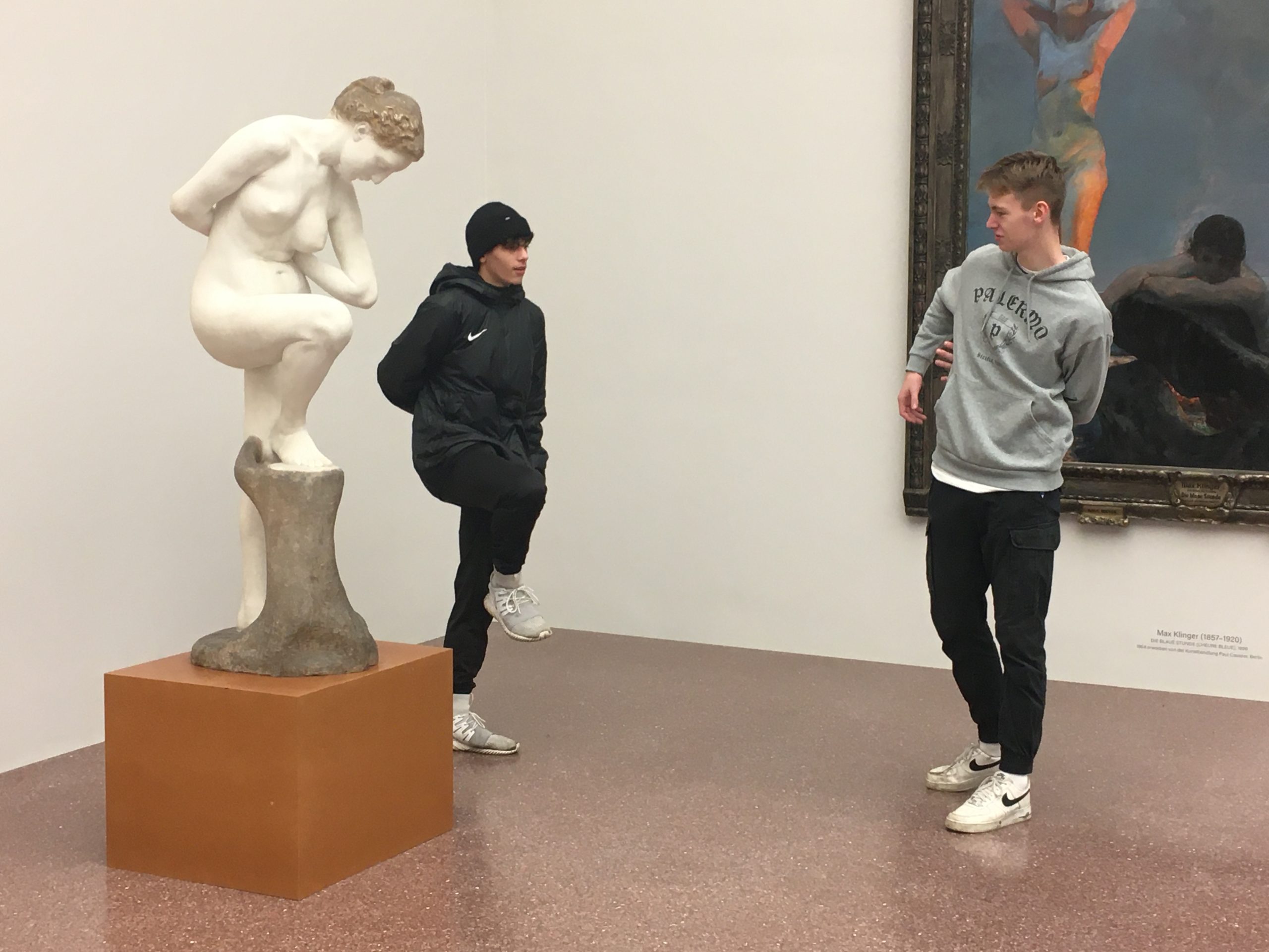 Der Kurs 11kun1, der sich bereits im Unterricht mit dreidimensionalen Kunstwerken auseinandergesetzt hatte, erkundete in dem Workshop KÖRPERISCH, mit welchen gestischen und gestalterischen Mitteln in zwei- und dreidimensionalen Kunstwerken welche Botschaften vermittelt werden können, betrachtete entsprechende Werke, stellte Gemäldeszenen und Skulpturen nach, erfasste Körperhaltungen zeichnerisch