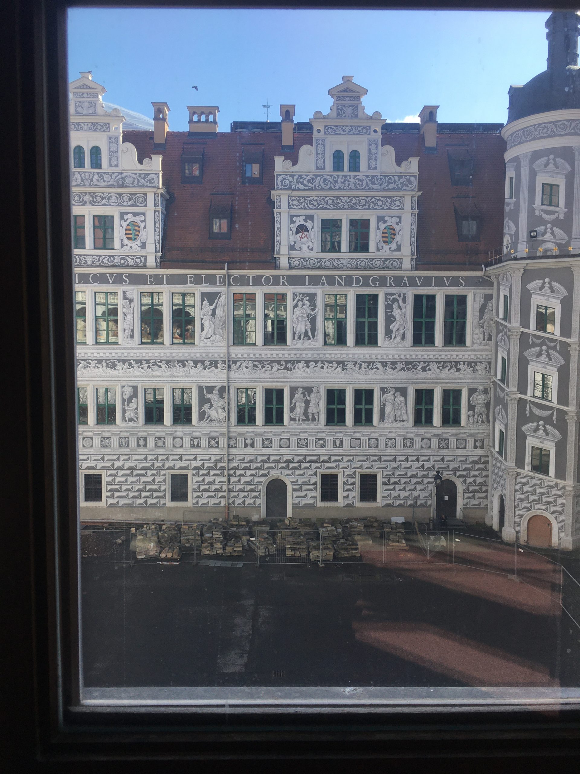 Unser Ziel: Das Dresdener Residenzschloss mit seinen vielen Museen. Der Vorläufer des Schlosses in der Dresdener Altstadt mit Sicht zum Zwinger wurde schon ab 1220 als Burganlage auf dem dortigen Hügel errichtet, ab 1486 zur vierflügeligen Renaissanceschlossanlage umgebaut und ab 1530 erweitert, zum Beispiel um den Georgenbau zur Elbe hin, dem nun neuen Eingangstor nach Dresden. Im Februar 1945 fiel das Schloss wie die gesamte Dresdener Innenstadt mit ihren jahrhundertealten architektonischen Juwelen und Kunstschätzen dem verheerenden Brand während der Bombardierung zum Opfer.