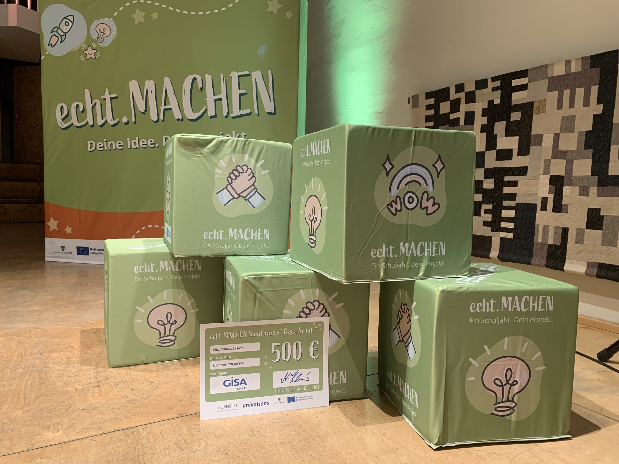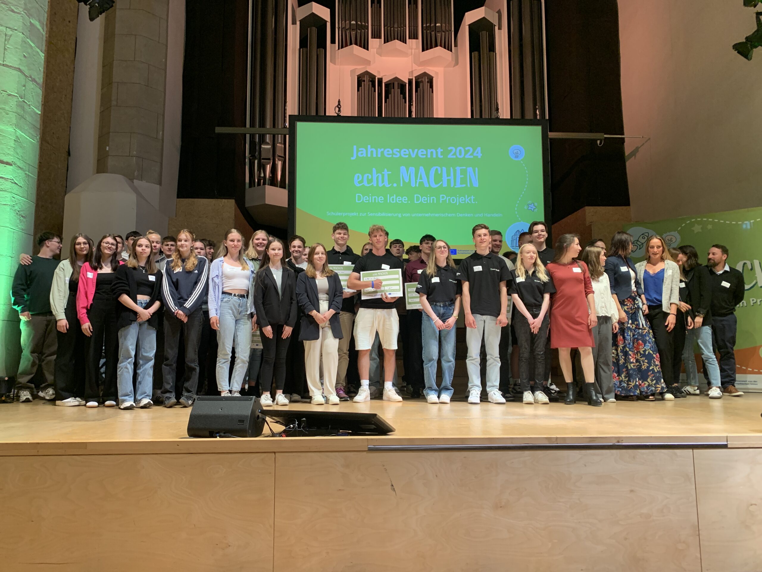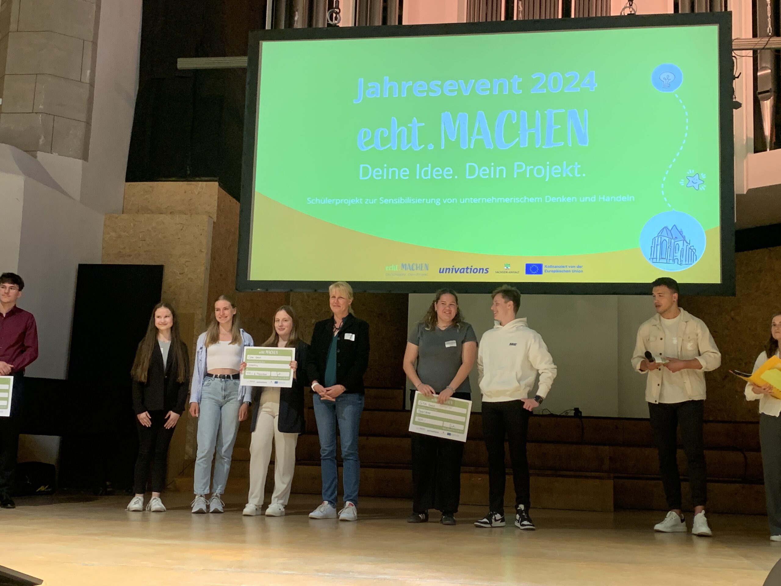 Am 12.06.2024 fuhren die Wirtschaftsschüler der 11. Klasse gemeinsam mit zwei Fachlehrern zur Abschlussveranstaltung des Projekts „echt.MACHEN“ nach Halle. Insgesamt vier Schülergruppen unserer Schule durften ihre Projekte auf der Bühne der Ulrichskirche präsentieren. Alle anderen Gruppen stellten ihre Idee mit einem Plakat vor. Es war ein sehr erfolgreicher Tag für das Gymnasium Jessen, denn erst wurden wir als beste Schule mit 500 Euro prämiert und dann bekamen auch noch vier unserer Teams die Zusage  weiterer strategischer und planerischer Unterstützung von den Sponsoren des Wettbewerbs aus verschiedenen wirtschaftlichen Branchen. Die Projektideen mit den Bezeichnungen „Dementia“ und „BEEClever“ wurden zusätzlich mit Geldprämien für ihre sehr gute Arbeit prämiert. Die Projekte müssen an dieser Stelle nicht enden und können auch im neuen Schuljahr präzisiert und ausgebaut werden. Alle Schüler haben unser Gymnasium würdig vertreten und auch diejenigen, die keinen Preis errangen, haben einiges an Erfahrung sowie wichtige Soft Skills erworben.