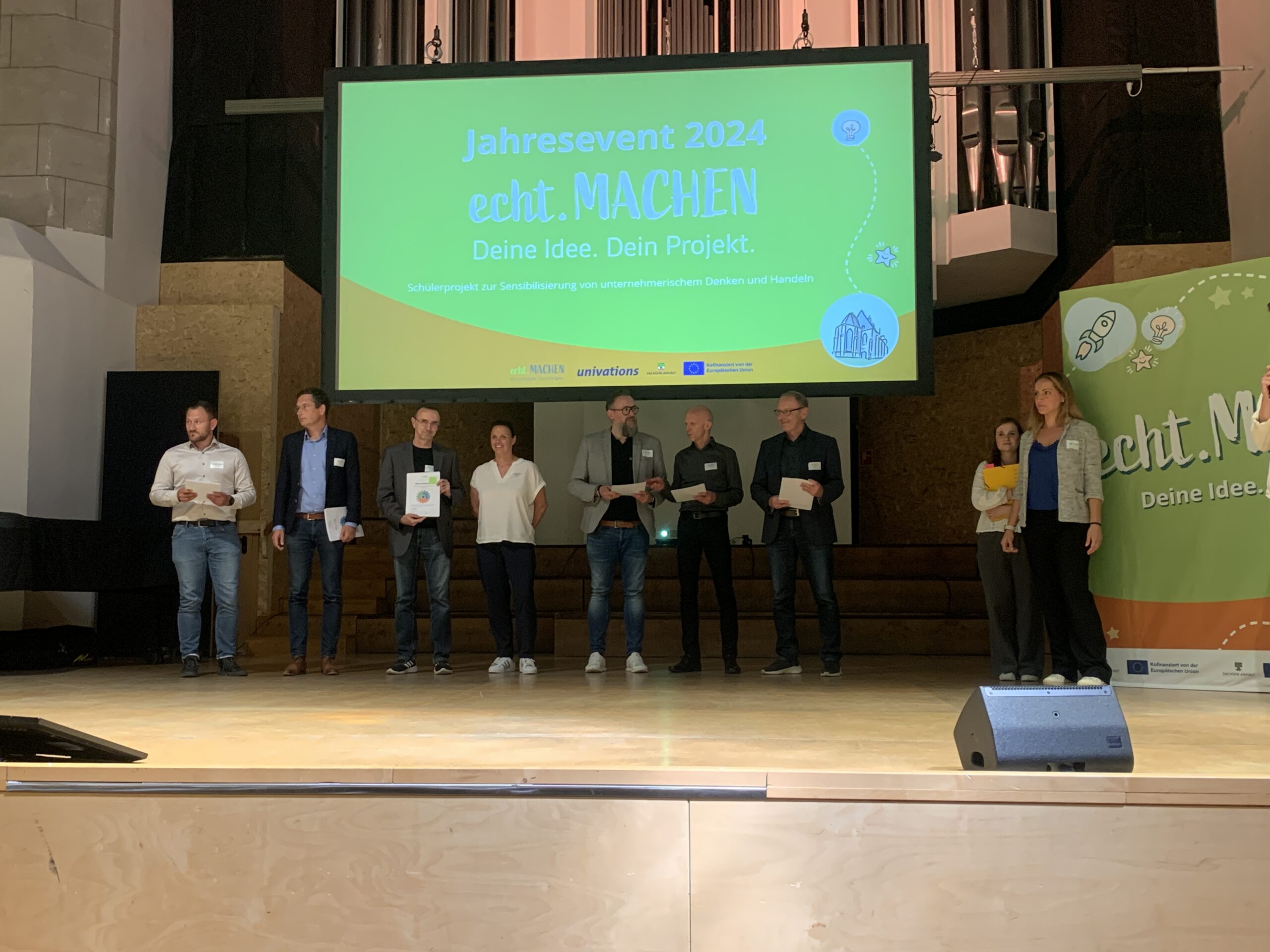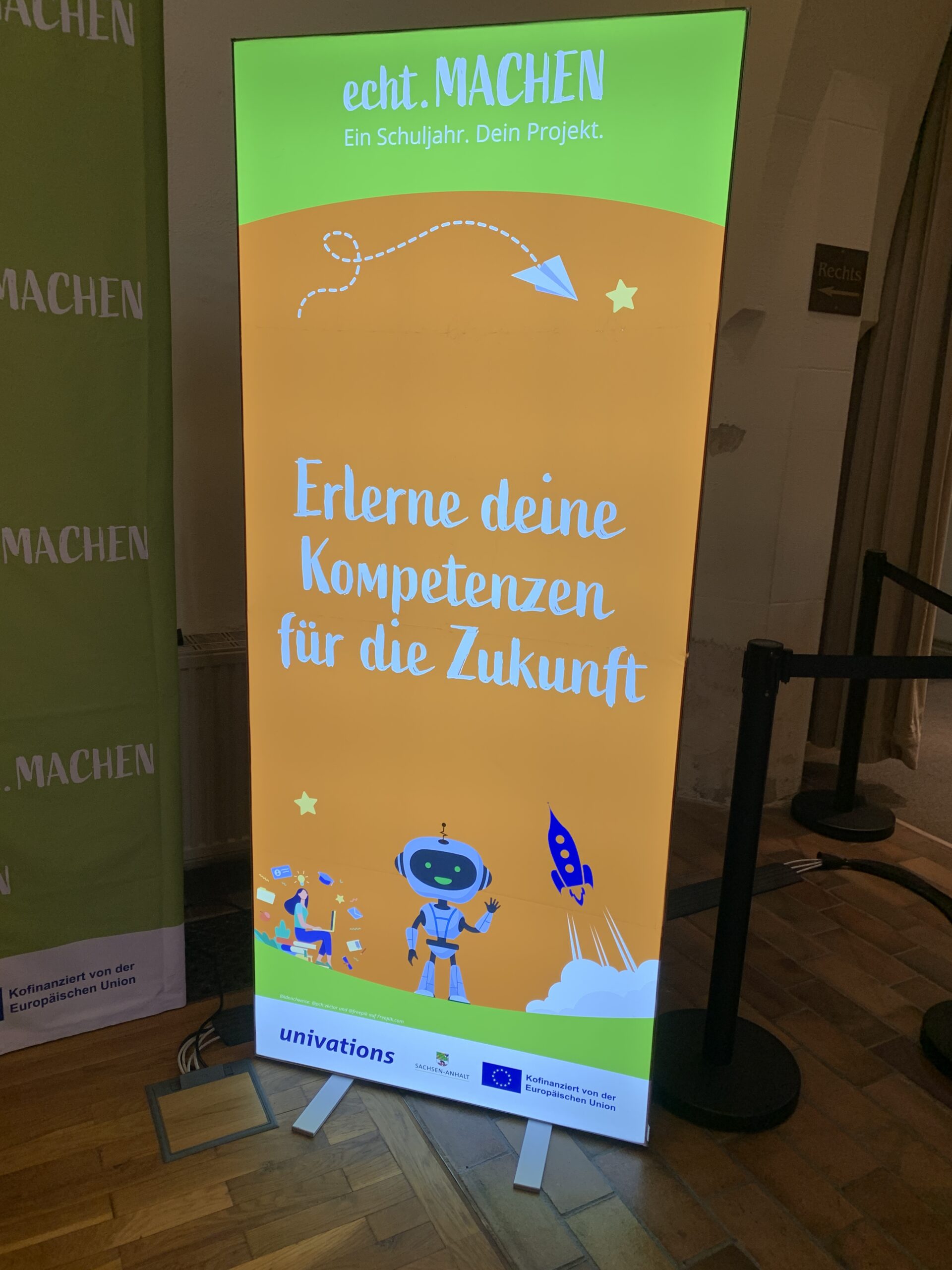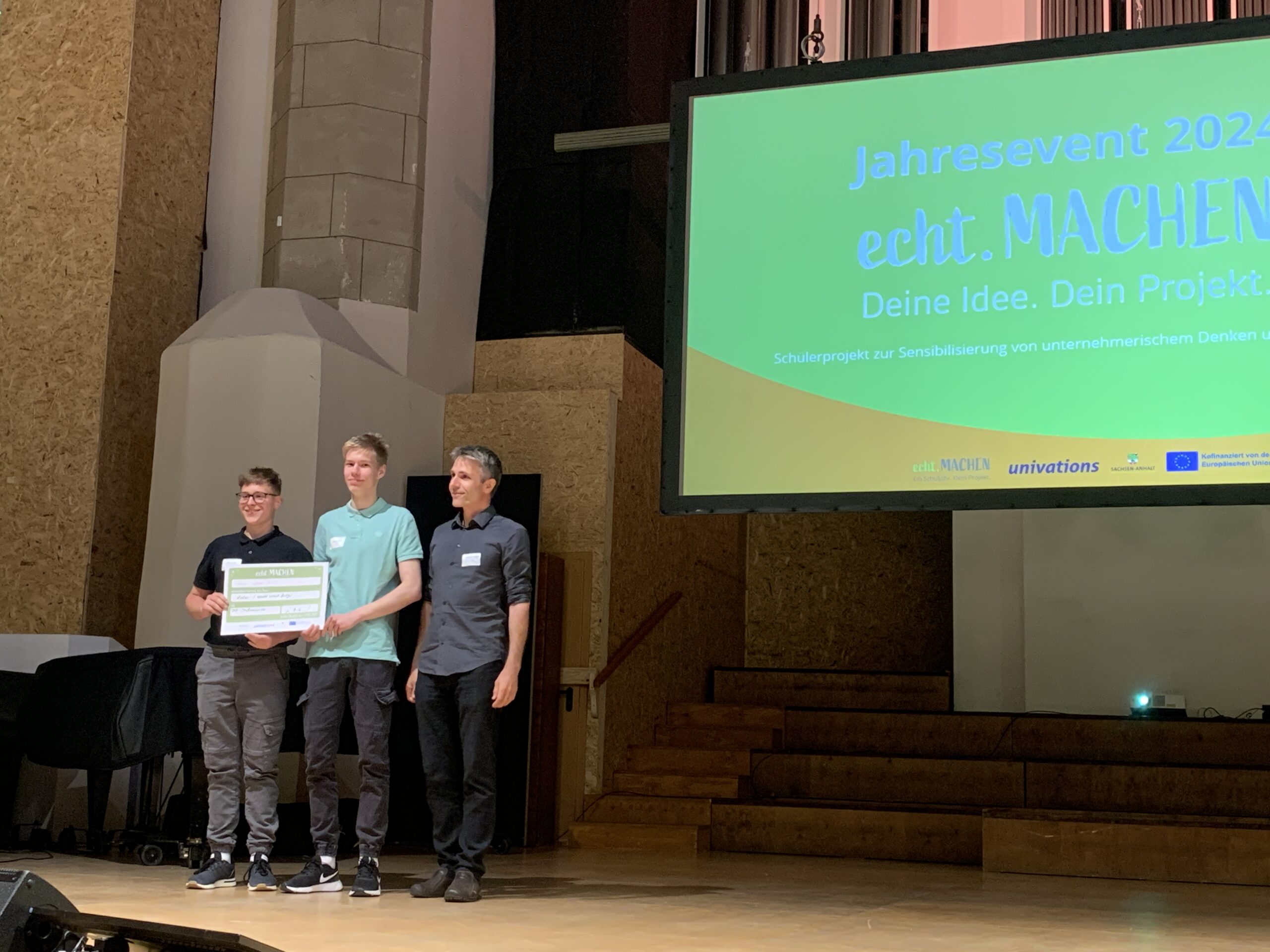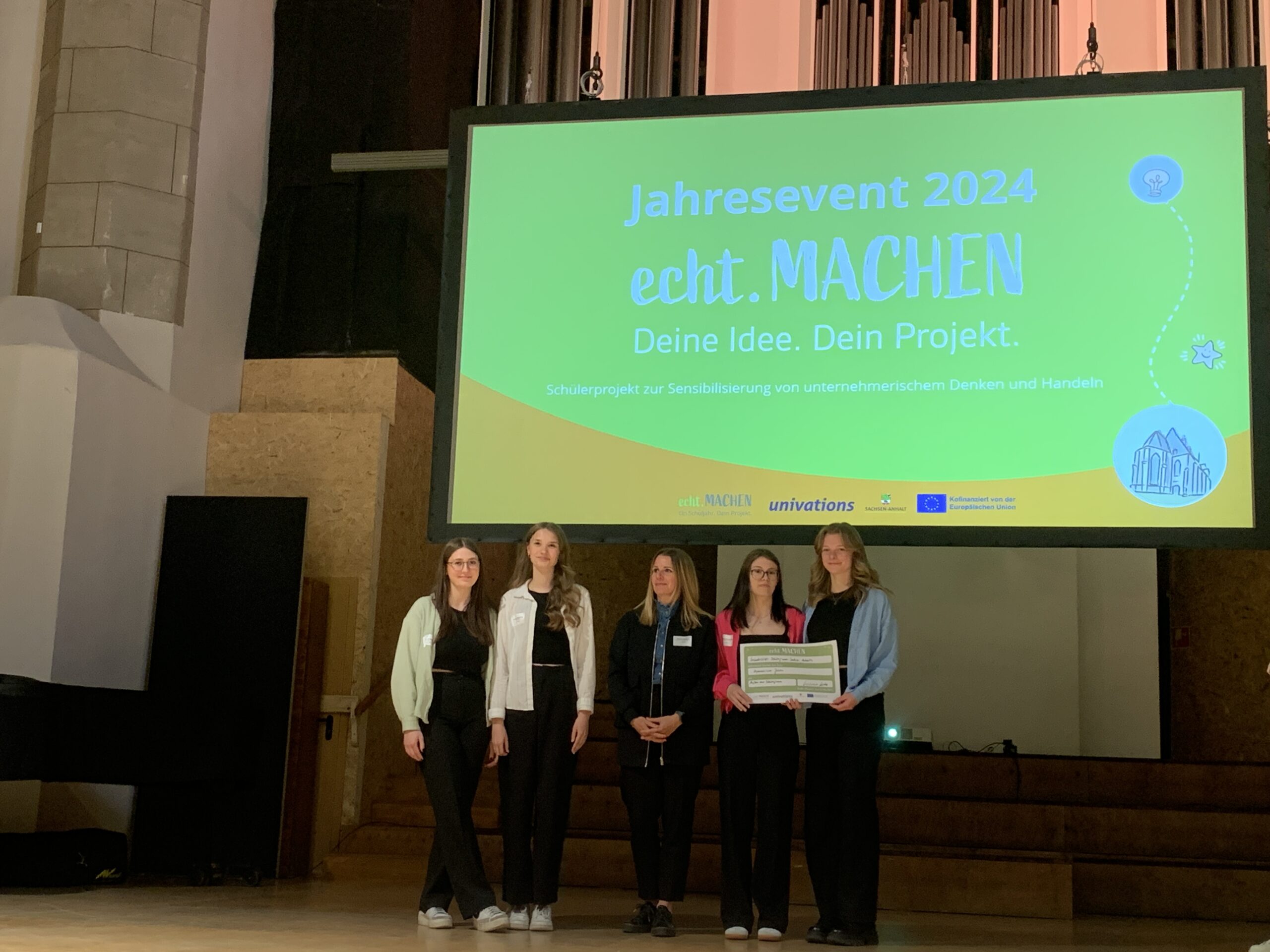 Am 12.06.2024 fuhren die Wirtschaftsschüler der 11. Klasse gemeinsam mit zwei Fachlehrern zur Abschlussveranstaltung des Projekts „echt.MACHEN“ nach Halle. Insgesamt vier Schülergruppen unserer Schule durften ihre Projekte auf der Bühne der Ulrichskirche präsentieren. Alle anderen Gruppen stellten ihre Idee mit einem Plakat vor. Es war ein sehr erfolgreicher Tag für das Gymnasium Jessen, denn erst wurden wir als beste Schule mit 500 Euro prämiert und dann bekamen auch noch vier unserer Teams die Zusage  weiterer strategischer und planerischer Unterstützung von den Sponsoren des Wettbewerbs aus verschiedenen wirtschaftlichen Branchen. Die Projektideen mit den Bezeichnungen „Dementia“ und „BEEClever“ wurden zusätzlich mit Geldprämien für ihre sehr gute Arbeit prämiert. Die Projekte müssen an dieser Stelle nicht enden und können auch im neuen Schuljahr präzisiert und ausgebaut werden. Alle Schüler haben unser Gymnasium würdig vertreten und auch diejenigen, die keinen Preis errangen, haben einiges an Erfahrung sowie wichtige Soft Skills erworben.