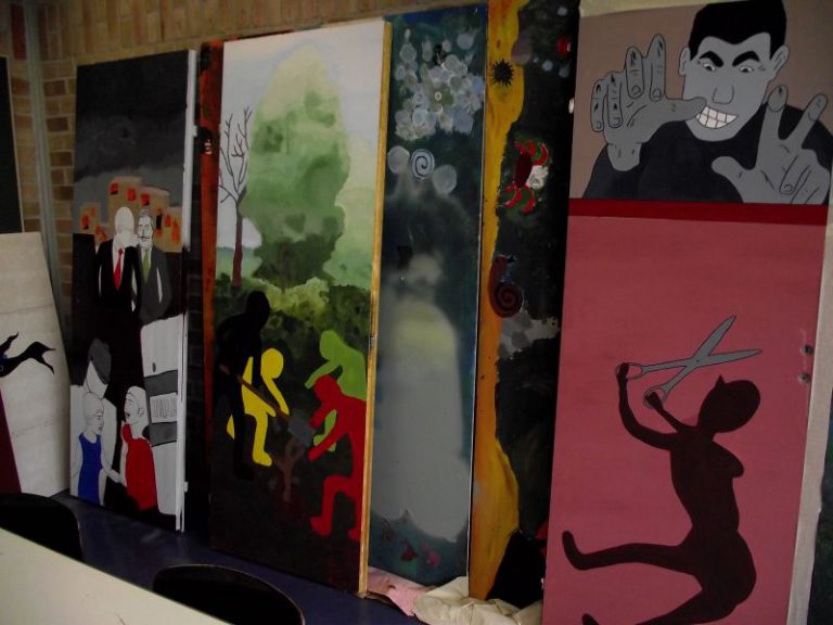 Aber auch Plakate für Schulveranstaltungen, Theaterkulissen, Bildelemente z.B. für Chorauftritte und andere öffentlich wirksame Gestaltungen können im Kunstunterricht geplant und teilweise auch umgesetzt werden.